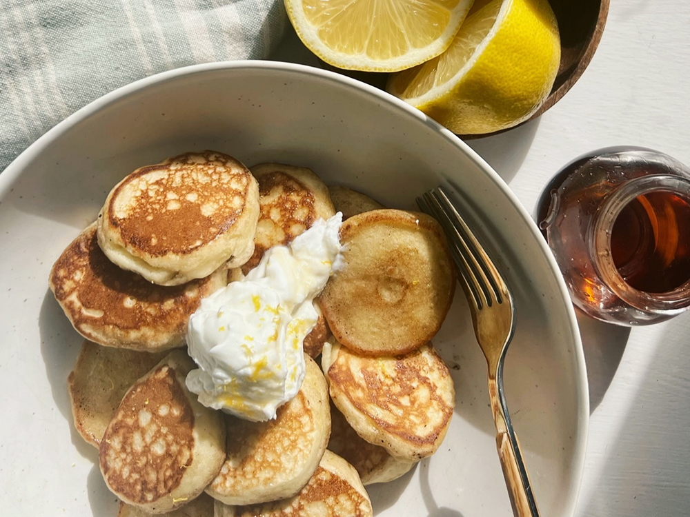 - 완성된 팬케이크를 볼에 담고, 그릭 요거트, 레몬즙, 레몬 제스트를 올려 마무리합니다.